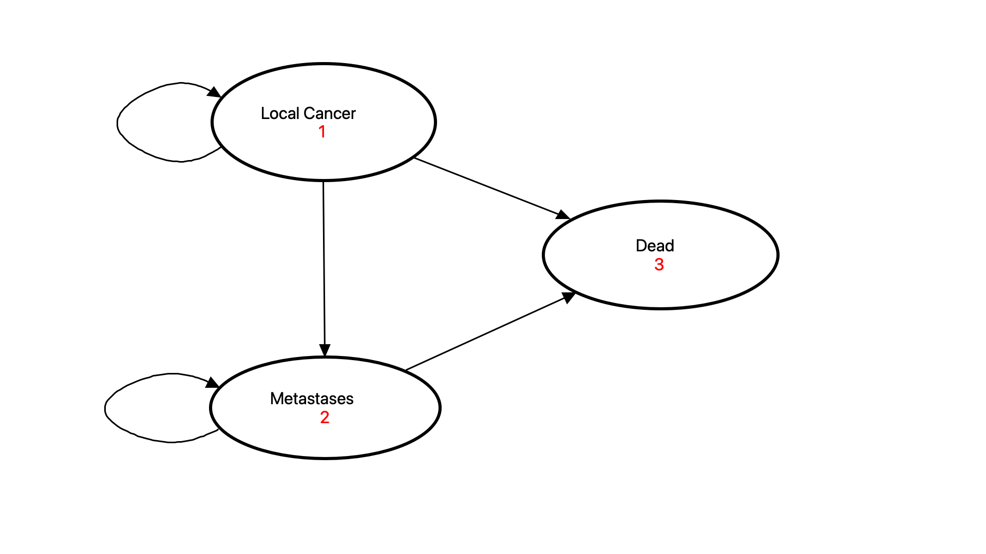 For example, you might be modeling cancer progression over time. Markov models handle this seamlessly with a framework of health states and events. Patients start each cycle in a health state, then pass through event patient pathways within a time cycle, resulting in a different distribution of patients among the health states to start the next cycle. This allows a relative simple set of progression, death and other events to occur for different patients at different times in the future.