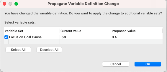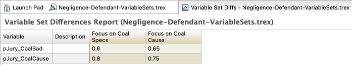 Note the Variable Set selected is Focus on Coal Specs at the right of the Variables View toolbar. This model has a second Variable Set Focus on Coal Cause as shown below. Two variable definitions vary betwee the sets - pJury_CoalBad and pJury_CoalCause.