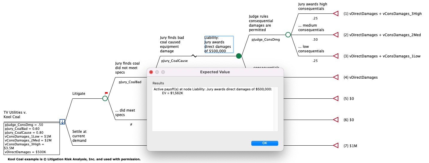 The Build a Legal Model includes a detailed description of the basic concepts used in calculating expected values in decision trees. Refer to that chapter, or one of the books listed at the end of the chapter for a review of basic concepts.