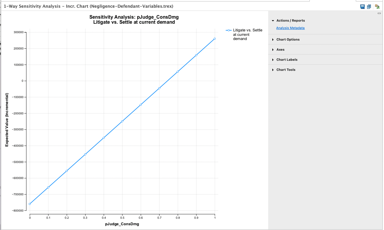 For each input value, you see the Rankings analysis from the model analysis. Note that for this specific input example, the results change for the Litigate strategy, but not for the Settle strategy.