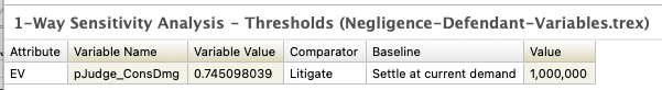 If there were thresholds where one strategy's line crossed another, the Thresholds Report (link to right of graph) shows each threshold in the graph in a text format. Below is an example Thresholds Report for pJudge_ConsDmg over the range 0 to 1.0 to demonstrate thresholds which could occur.