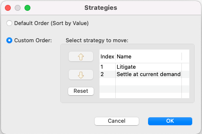 The strategies are sorted within each grouping based on a default ordering - Litigate and then Settle. You can choose to override the default sort via the option "Change order of strategies" to the right of the report. In this case where the cost of the strategies changes, we have chosen the option to maintain the order of strategies regardless of which was the least costly.