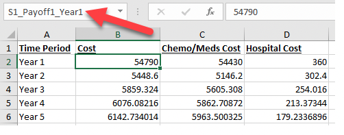 The table of exported data includes a row for each time period and a column for each payoff set. Each data cell is named with a reference to the strategy, payoff set and time period for easy reference in Budget Impact calculations. For example, cell B2 is named S1_Payoff1_Year1. (You can choose to overwrite the Payoff1 in the name using the Export Cell field found when exporting using the Budget Impact View). Each column can also be referenced as a range (e.g., S1_Payoff1_Range) that includes all time periods.