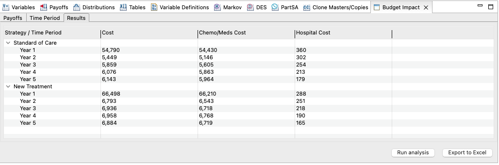 We will use the Health Care tutorial example Budget Impact Markov.trex to export cost data for each Strategy for specific time periods.