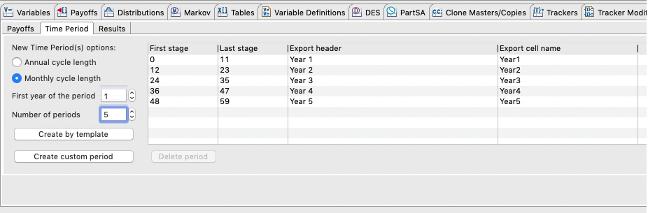 If the cycle length is monthly, you can use the radio button and create by template options. Refer to the figure below where the first year in BI output would be stages 0 - 11. If your cycle length were weekly, then you can create custom periods and you would need to enter the appropriate stages 0 - 51 for the first year.