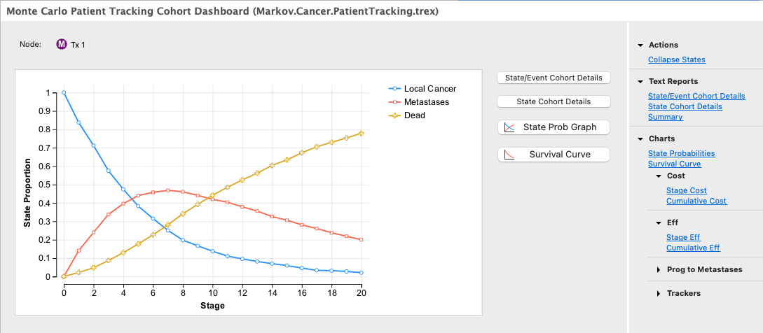 We will examine cohort-level patient tracking for the first strategy Tx1. From the Microsimulation results, click Patient tracking reports, select the report type Cohort and click OK. This generates a dashboard very similar to the Markov Cohort Analysis dashboard for cohort models.