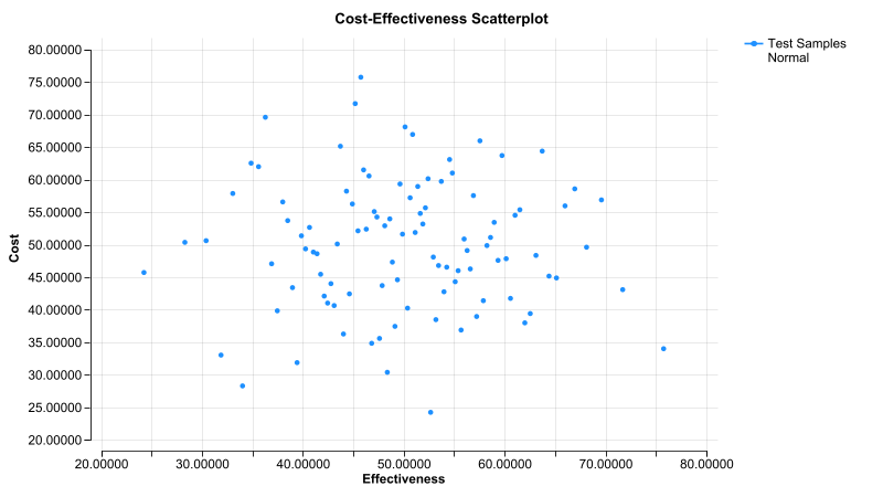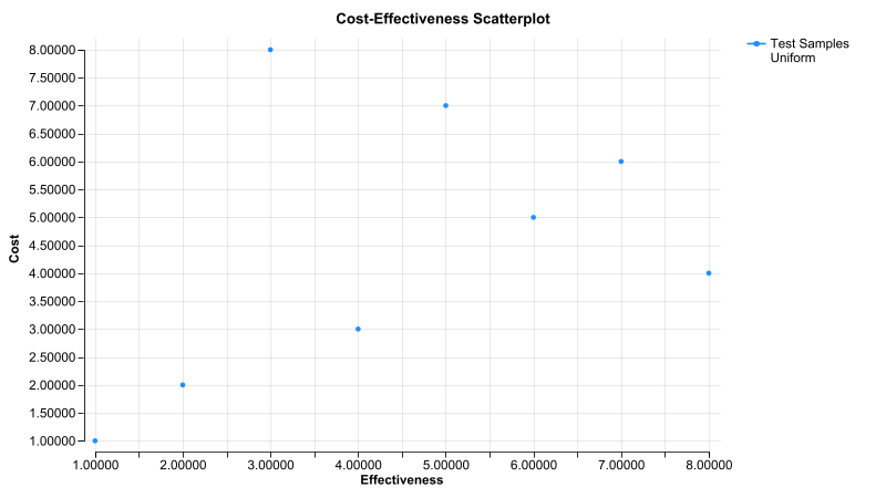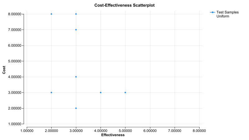 If we run PSA with 8 iterations on the first strategy without LHS, the distributions will be sampled independently. The CE scatterplot below illustrates these samples with one distribution for "cost" y-axis and the other for "effectiveness" x-axis.