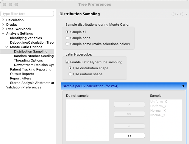 Latin Hypercube Sampling restricts sampling to avoid previously drawn samples within the overall hypercube. Now let's run the same analysis with Latin Hypercube Sampling through Tree Preferences > Monte Carlo Options > Distribution Sampling as shown below.