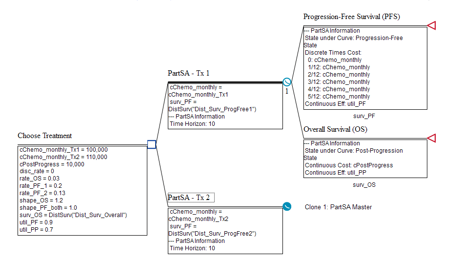 The model above is based on the PartSA-Example.trex model we looked at earlier in detail. However, this model has a decision node with two strategies. The second strategy is a clone of the first one. Two parameters differ between the strategies - the rate/distribution for the PFS state and the cost of chemotherapy.