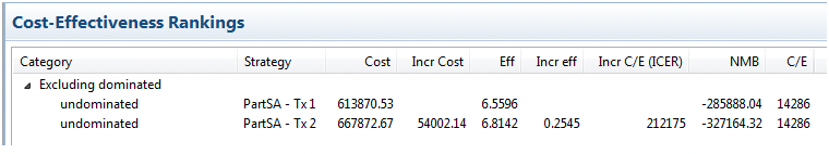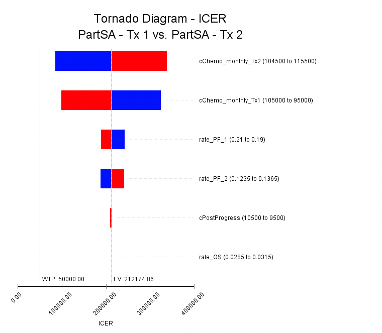 You can also run all forms of sensitivity analysis on PartSA models - including 1-way, tornado, probabilistic, etc. We will not examine all of these here as those techiniques are described in detail in other chapters. (Deterministic Sensitivity Analysis and Probabilistic Sensitivity Analayis on CE models.) We will, however, run a tornado diagram here.
