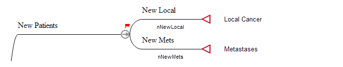 In this model, the Entry node is called New Patients and the subtree associated with the Entry node adds nNewLocal members to the Local Cancer and nNewMets members to the Metastases state each cycle.