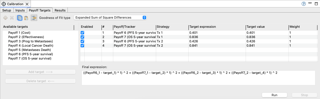 Target expression: Set the target value/formula for the model output and strategy selected. The calibration process will then attempt to match the output to that target by changing input values. In the example model, Payoff 6 for Tx1 has a target value of 0.401.