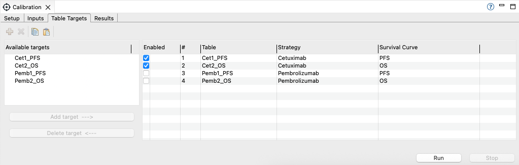 Available targets: This lists all model tables (in the Survival Table Cohort calibration). Choose the Kaplan-Meier survival table you want to use and click the "Add target" button. Use the "Delete target" button to remove a selected output.