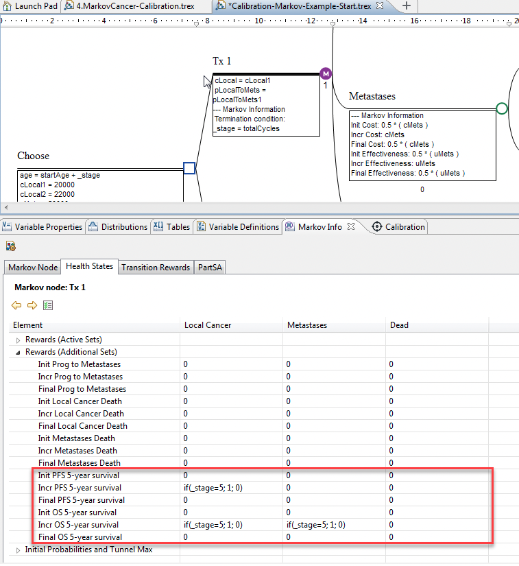 With these payoffs and state rewards in place, 5-year progression-free survival and 5-year overall survival are now primary outputs of the model, ready for use during calibration.