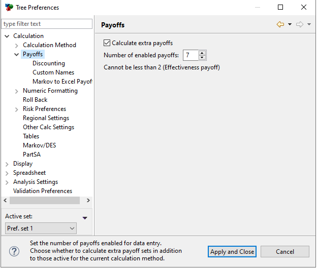 Healthcare Example Model, MarkovCalibration_3a_Payoffs_PreCal.trex already has the outcomes in place, but we can examine these elements of the model. Note that the model is setup for 7 payoff sets. This generates 5 extra outputs beyond the primary ones - cost and effectiveness. The section below shows the extra payoffs in the model.